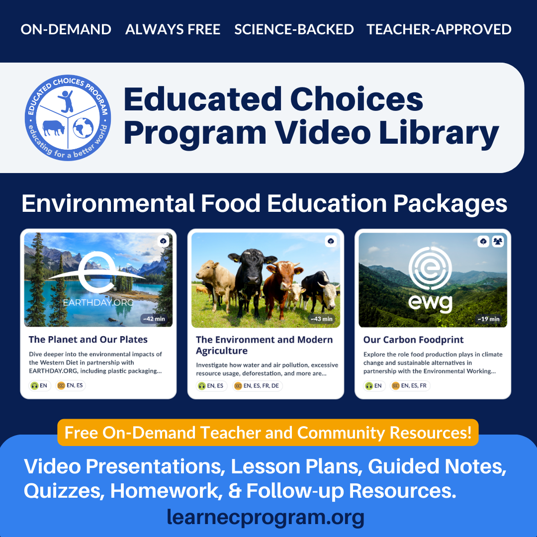 By using free, innovative, and accessible food system education tools, such as those provided by the Educated Choices Program (ECP), into your curriculum and encouraging self-expression in your students through accompanying activities and projects, you can give youth the knowledge they need to take action. ECP offers easy-to-implement tools and ideas to bring these education initiatives into many areas of study. These innovative on-demand academic resources are created by teachers for teachers and meet academic standards in all 50 US states, all Canadian provinces and many other regions of the world. The educational videos and accompanying lesson plans, quizzes, homework, and activities are designed for students ages 12+ and address the topics of deforestation, water degradation, climate change, ocean acidification, food waste, and more. All topics are covered in an easily accessible and non-judgmental manner, allowing for critical thinking among the student body and for easy integration into curricula cross-departmentally.