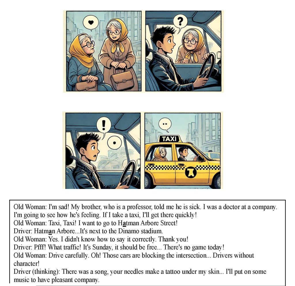 The second layer of this lesson was focused on human values. Grammatical concepts were woven into a story emphasizing compassion. Using AI, I designed a cartoon about an elderly woman taking a taxi to visit her sick brother. Words with difficult accents in Romanian, like taxi, traffic, and ill were not used in isolated sentences, but threaded through a text that encouraged emotional connection. At one point in the story, the old woman mispronounces a word, confusing the driver. This sequence was intended to highlight the importance of being polite when correcting an accent mistake.