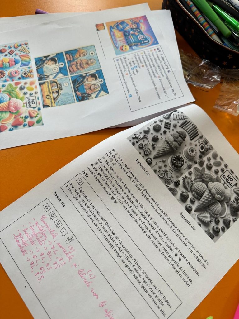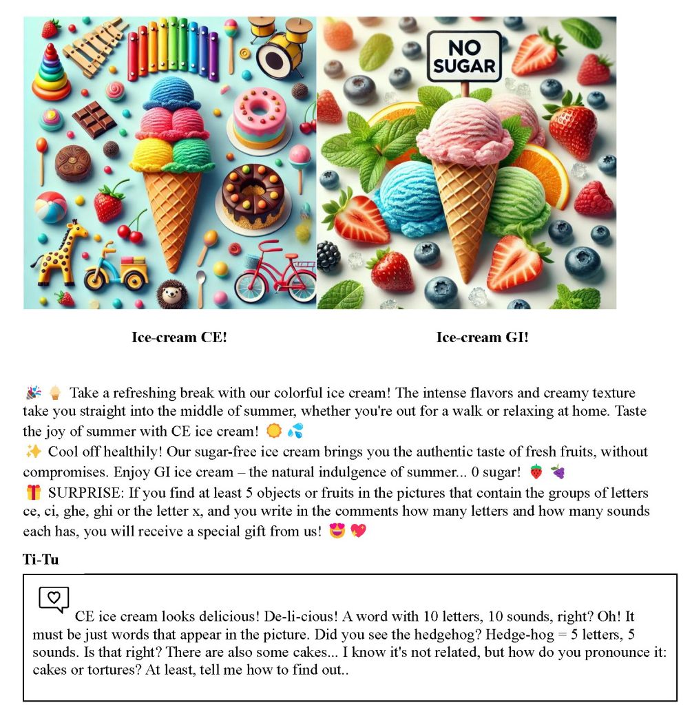 Thirdly, the OECD ‘transformative competencies’ layer came to surface. AI helped me write an ad for two fictional ice-creams, a regular and a sugar free one. I wanted my students to reflect on the complexity of life, especially concerning those children who are unable to consume certain foods. But at the same time, this worksheet challenged students to identify objects that contained specific letter groups and to analyse their pronunciation. A ‘surprise’ contest like those you see on social media was also added to stimulate critical thinking. At this level, interleaving was used not only to enhance long-term retention, but also to improve problem-solving skills and adaptability to a new context.